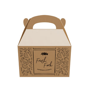 - Present your meals with ease using custom gable box / lunch boxes designed for functionality and convenience. The greaseproof lining keeps oils contained, while the built-in handle makes carrying orders effortless. Freezer-safe for storing treats, these boxes offer a reliable, practical packaging solution that reflects your brand’s focus on quality and customer satisfaction. See details
